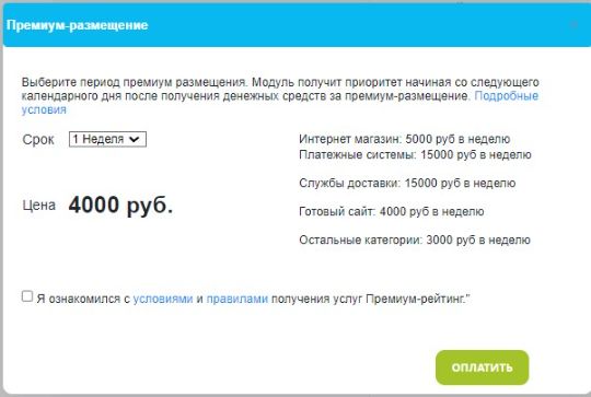 Подключить услугу просто — выбрать параметры прямо в карточке решения. Цена Премиум-рейтинга зависит от категории, к которой привязана интеграция. Услуга активируется автоматически на следующие сутки после поступления оплаты.